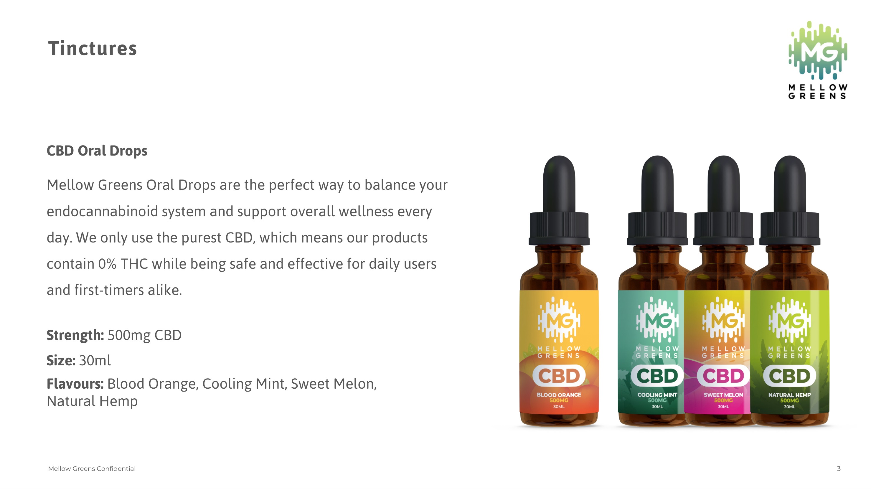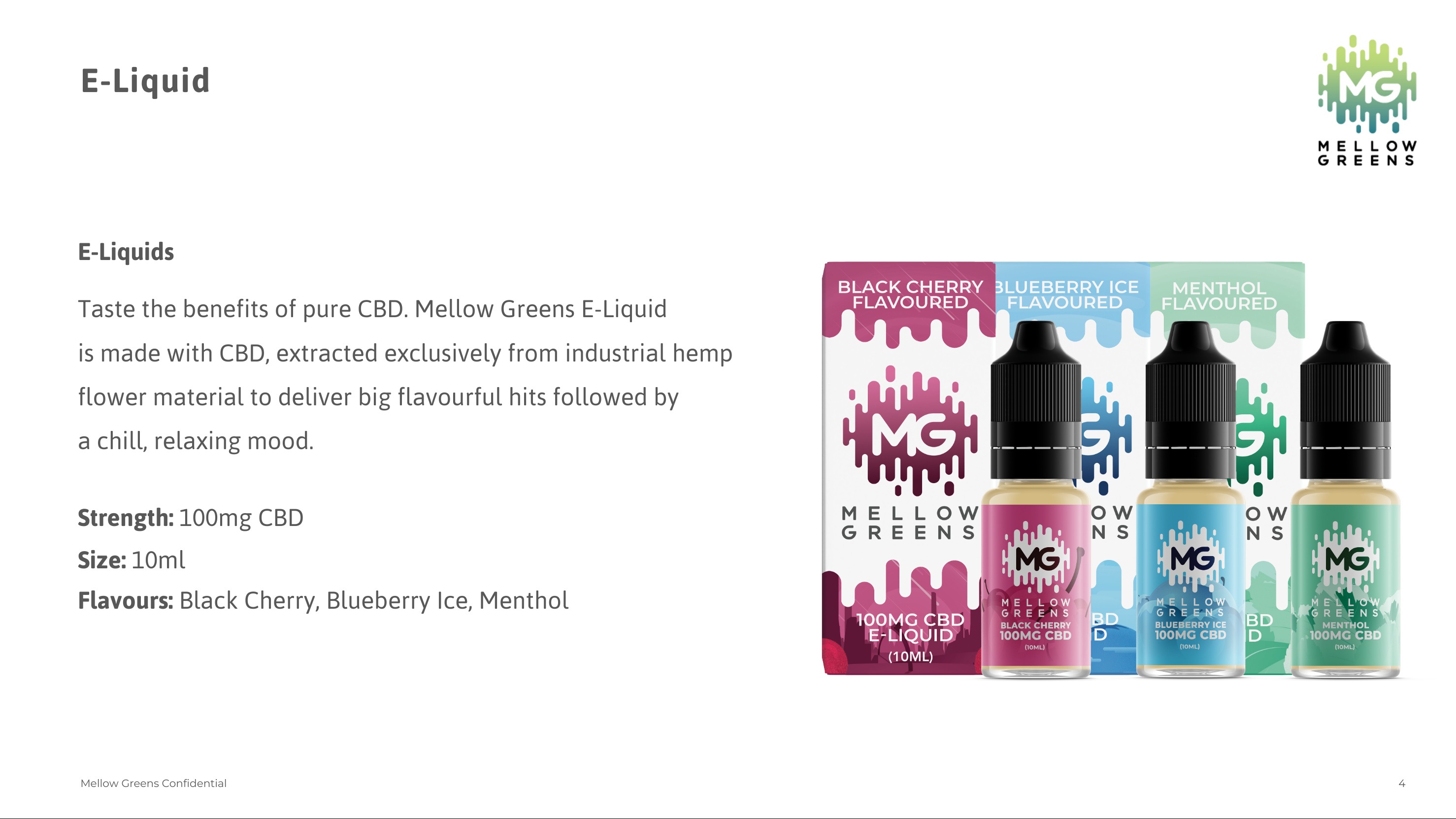 Oral Drops Mellow Green Oral Drops are the perfect way to balance your endocannabinoid system and support overall wellness every day. We only use the purest CBD, which means our products contain 0% THC while being safe and effective for daily users and first-timers alike. Strength 500MG Size 30ml Flavours: Blood Orange, Cooling Mint, Sweet Melon, Natural Hemp E-Liquid Taste the benefits of pure CBD, Mellow Greens E-Liquid is made with CBD, extracted exclusively from industrial hemp flower material to deliver big flavourful hits followed by a chill, relaxing mood. Strength: 100mg CBD Size: 10ml Flavours: Black Cherry, Blueberry Ice, Menthol